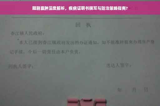 摘要:本文介绍了腱鞘囊肿的相关知识,包括疾病定义、症状表现以及防治策略。文章还涉及了腱鞘囊肿疾病证明书的撰写要点。通过深入了解腱鞘囊肿,我们能更好地认识这一病症,并采取相应的防治措施。正确书写疾病证明书对于患者的诊断和治疗具有重要意义。