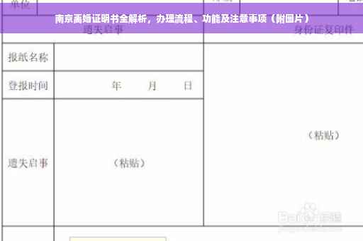 摘要:南京离婚证明书是证明婚姻关系解除的重要文件。办理流程包括提交相关证件和材料至民政局,经审核后领取。离婚证明书在房产过户、子女抚养等方面具有法律效力。注意事项包括确保提交材料真实完整、遵守法定程序等。本文附有相关图片,方便理解。