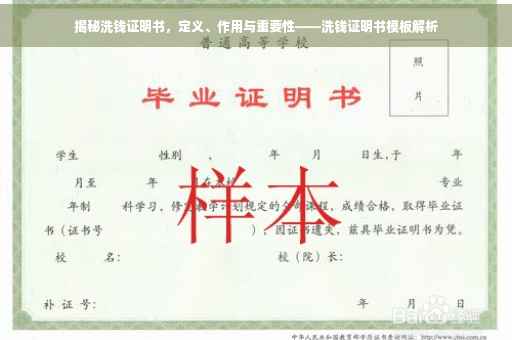 洗钱证明书是由金融机构或相关部门出具的一种证明文件,它主要用以证明某笔资金或交易是合法合规的,并不涉及任何洗钱等非法行为,这份证明书通常详细描述了交易的背景、资金来源、交易目的、交易过程及其他相关证明文件,通过这些详细信息,金融机构和相关部门可以准确判断该交易是否存在洗钱风险。