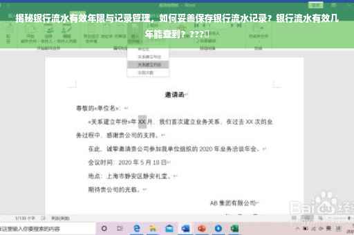 银行流水记录作为个人和企业经济活动的重要凭证,其有效年限因不同需求和政策法规而异,妥善管理银行流水记录,不仅有助于个人和企业的经济决策,还能在关键时刻提供有力证据,建议个人和企业至少保留银行流水记录两年以上,并采取有效措施进行管理和保护,希望通过本文的介绍,能帮助您更好地了解银行流水有效年限及如何妥善管理您的银行流水记录。