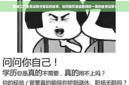 摘要:本文将介绍工厂使用证明书的撰写要点,同时揭示其背后的故事和真实情况。通过本文,你将了解到如何撰写一份准确、完整的工厂使用证明书,包括证明的目的、工厂信息、使用情况和评估等内容。本文还将探讨工厂使用证明书的重要性及其在实际生产中的应用价值。
