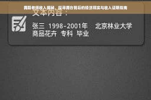 摘要:本文将探讨舞蹈老师的收入证明问题,揭示舞台背后的经济现实。文章将介绍舞蹈老师的收入来源,包括教学、演出等方面,并说明收入证明的重要性。将提供舞蹈老师收入证明的写作要点和注意事项,帮助读者更好地了解舞蹈老师的经济状况和职业特点。通过本文的阐述,读者可以更全面地了解舞蹈老师的职业收入和现实生存状态。