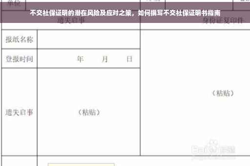 近年来,不交社保证明书的现象逐渐受到社会的关注,一些人可能因为各种原因选择不交社保,这其中可能涉及到个人的职业规划、经济压力以及对未来的担忧等因素,不交社保可能会给个人带来一系列的风险和潜在问题,本文将探讨不交社保证明书的风险所在,并为大家提供一些应对之策。