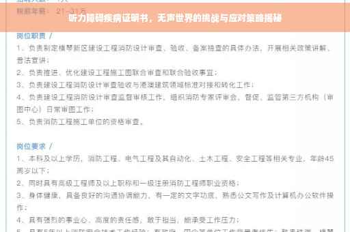 摘要:,,本证明书旨在阐述听力障碍疾病的挑战及应对方法。听力障碍给患者带来无声世界的困扰,影响日常生活与沟通。本证明书将详细说明如何撰写,内容包括患者基本信息、诊断结果、听力损失程度等。提供应对听力障碍的建议,如佩戴助听器、参加康复训练等,以帮助患者适应并克服听力障碍带来的挑战。