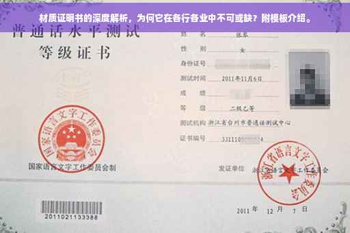 材质证明书在各行业中发挥着举足轻重的作用,不仅保障了产品的质量和安全,还促进了商品交易和国际贸易的发展,随着工业化的快速发展和商品交易的日益频繁,材质证明书的重要性将更加凸显,各行业应高度重视材质证明书的作用,确保材料的质量,从而提高产品的质量和竞争力。