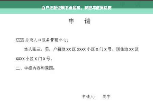 在当今社会,信用体系日益完善,信用记录的重要性愈发凸显,对于个人而言,保持良好的信用记录不仅关系到金融交易的顺利进行,更在某种程度上决定了个人在社会中的信任度,白户还款证明书作为信用证明的一种,对于申请贷款、信用卡等金融产品具有重要的参考价值,本文将详细介绍白户还款证明书的获取方式、使用场景及注意事项,以帮助广大读者更好地理解和运用。