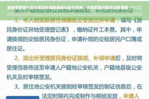 随着金融市场的不断发展和人们对金融服务的多样化需求,异地调查银行流水逐渐成为了核实个人或企业财务状况的重要手段,本文将深入探讨异地调查银行流水的背景目的、真相揭秘、操作指南以及实际操作中的注意事项与技巧,帮助读者更好地了解这一领域。
