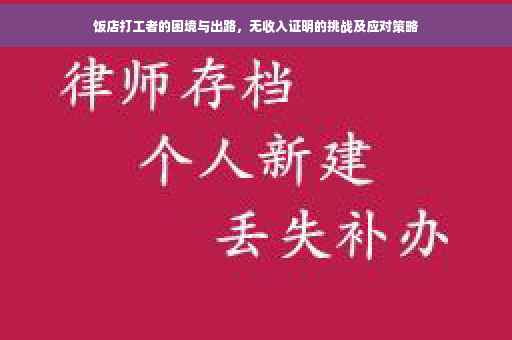 摘要:,,许多饭店打工者面临无收入证明的困境,这不仅影响他们的生活质量,也限制了职业发展和享受社会福利的机会。面对这种情况,打工者需要积极寻找解决方案,如寻求雇主支持、建立工作记录、寻求法律援助等。政府和社会各界也应关注这一问题,采取措施改善打工者的就业环境,保障其合法权益。无收入证明并非无法改变,通过多方努力,打工者依然能够找到出路。