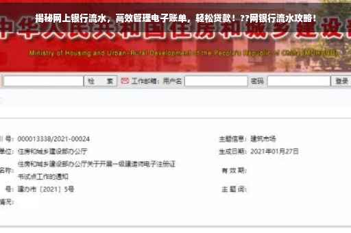 摘要:本文将揭示网上银行流水的秘密,教你如何高效管理电子银行账单,让你的财务规划更加清晰。通过优化银行流水记录,提高贷款申请成功率。掌握有效管理银行流水的方法,让你的资金运作更加顺畅。本文为你提供实用的网上银行流水管理技巧,助你轻松应对贷款申请过程中的银行流水审核。