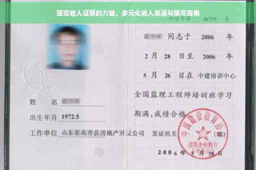 摘要:固定收入证明是多元化收入来源的稳定力量,对于个人和企业而言都至关重要。除了常见的工资收入证明外,其他固定收入证明也需详细书写,包括租金收入、投资收益等。撰写时需注意格式规范,内容真实准确,包括收入类型、金额、时间等细节。固定收入证明的撰写有助于个人或企业提高信用度,实现财务稳定。