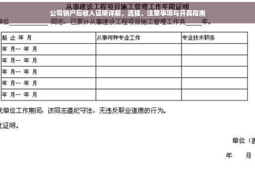 摘要:公司销户后需要开具收入证明时,需了解相关流程与注意事项。需准备齐全公司销户证明、个人身份证明、税务证明等材料。前往银行查询销户后的资金情况并获取相关证明。在开具收入证明时,应注意证明内容的真实性和完整性,避免遗漏关键信息。了解不同场合对收入证明的具体要求,确保证明的有效性。按照规范流程操作,注意细节,才能顺利开具公司销户后的收入证明。
