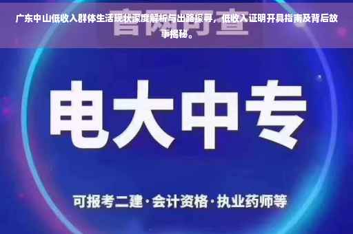广东中山低收入群体的生活现状深度解析,揭示其背后的故事与挑战,并探讨寻找出路。这些群体面临着经济压力和生活困境,需要社会各界的关注和支持。本文将介绍如何获取广东中山低收入证明,包括开具证明的机构、流程和所需材料,帮助低收入群体享受相关政策和福利,改善生活质量。