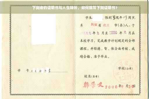 摘要:,,本文将探讨下岗者的证明书及其在人生转折中的作用。文章指出,虽然下岗者通常拥有官方颁发的证明书,但其真正意义和价值却因人而异。本文将通过描述下岗者面对困境时的心理挣扎和人生调整,反映证明书在帮助他们重新融入社会、寻找新的人生方向时所扮演的角色。文章也将探讨如何正确书写这样的证明书,以使其更具实际意义和人文化关怀。