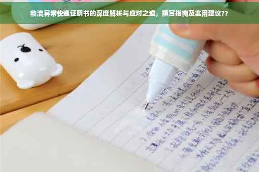 摘要:本文将探讨物流异常快递证明书的重要性及其撰写方式。文章将深度解析物流异常的原因,包括天气、交通等因素,并针对这些异常提供应对之策。本文还将介绍如何撰写物流异常快递证明书,包括必要的信息和格式要求。通过阅读本文,读者将了解如何有效地处理物流异常情况并正确撰写证明书,以确保物流运输的顺畅进行。