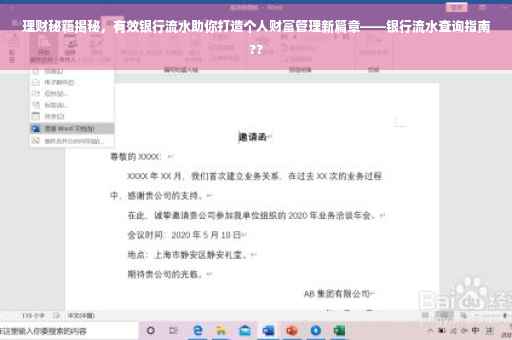 随着金融市场的不断发展和个人理财需求的日益增长,理财有效银行流水的重要性逐渐凸显,本文将详细介绍理财有效银行流水在个人财富管理中的关键作用,以及如何打造有效的银行流水,帮助读者更好地掌握理财技巧,实现个人财富的增值。