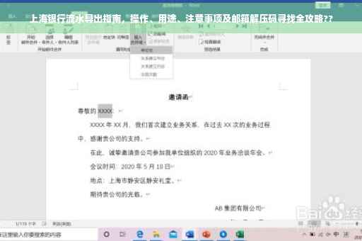 本文介绍了上海银行流水导出的全攻略,包括操作流程、用途和注意事项。详细说明了导出邮箱解压码的查找方法。对于需要导出银行流水的人,本文提供了重要的信息和指导,有助于顺利完成操作并避免不必要的麻烦。