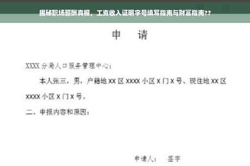 摘要:本文将介绍工资收入证明字号的重要性及其如何填写,揭示职场薪酬真相,为读者提供一份财富指南。通过本文,您将了解如何正确填写工资收入证明字号,获取真实的薪酬信息,助您在职场中取得更好的经济收益。无论您是职场新人还是资深人士,本文都是您不可或缺的参考指南。