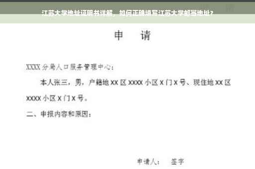 摘要:关于江苏大学地址证明书,江苏大学的邮寄地址填写应准确无误。地址一般包含学校名称、具体地址、所在城市及邮编。填写为“江苏大学某某校区,江苏省镇江市某街道某号,邮编XXXXXX”。请确保地址详细且正确,以便顺利收到邮件。