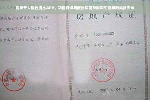 摘要:本文将揭秘各大银行的流水APP,包括其功能、特点和使用指南。警告读者关于所谓的“各大银行流水虚拟生成器”可能涉及违法犯罪问题,提醒公众要警惕此类非法行为,避免陷入法律风险。