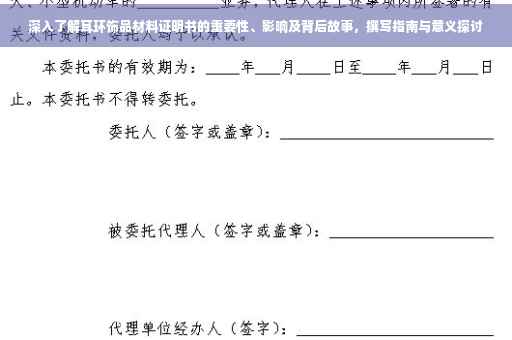 随着时尚产业的飞速发展,耳环饰品已成为人们日常生活中的重要配饰,在琳琅满目的市场中,如何选购高质量、真实材料的耳环成为了消费者面临的重要问题,这时,耳环饰品材料证明书的重要性便凸显出来,本文将深入探讨耳环饰品材料证明书的重要性、功能及其对整个行业和消费者产生的深远影响。