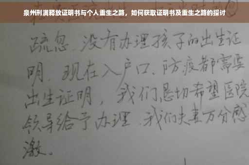 摘要:本文将介绍泉州刑满释放证明书的重要性及其在个人重生之路的作用。文章将简要说明如何获取这一证明书,包括具体的获取地点和流程。对于曾经服刑并成功完成改造、渴望重新融入社会的人们来说,刑满释放证明书是他们重新开始的重要凭证。