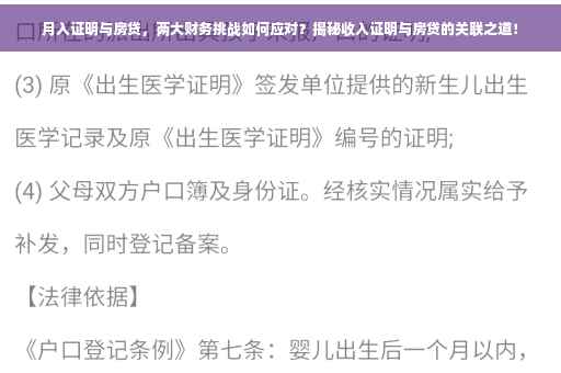 在现代社会,随着经济的不断发展和生活水平的提高,越来越多的人开始追求更高的生活质量,购房成为了许多人的重要目标,而房贷则是实现这一目标的主要途径之一,在申请房贷的过程中,收入证明成为了银行评估贷款申请人偿债能力的重要依据,本文将围绕月入证明与房贷两大财务挑战展开讨论,帮助大家更好地应对这些问题。