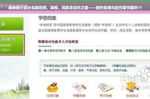 摘要:银行流水包装视频揭示了真相与风险,并提供了应对之策。这类视频旨在展示如何操作银行流水,但存在误导和潜在风险。观众应谨慎对待,了解真实流程和法律规定。本文还将介绍如何正确制作银行流水包装视频,以确保信息的准确性和安全性。