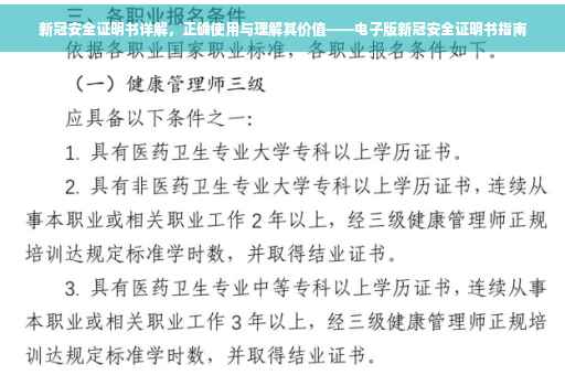 摘要:新冠安全证明书电子版是证明个人健康安全的重要文件。正确使用和理解其价值对于保障个人和他人的健康安全至关重要。该证明书能够证明个人已经接种新冠疫苗或检测结果为阴性,降低感染风险。使用时需注意证书的有效性、真实性和合法性。理解其价值的目的是确保个人安全,遵守防疫规定,共同抗击新冠疫情。