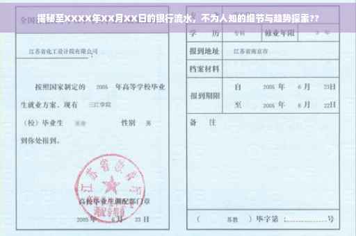 摘要:本文揭示了银行流水不为人知的细节与趋势,内容涵盖银行流水记录的各个方面,包括交易明细、资金流向等。文章明确指出银行流水记录到XXXX年XX月XX日为止,帮助读者了解近期银行流水动态和趋势。通过本文,读者可以更好地理解银行流水的重要性,以及如何从中获取有价值的信息。