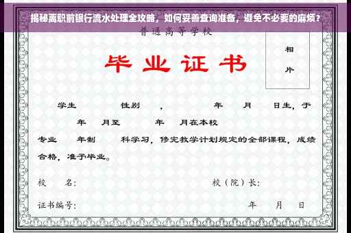 摘要:在离职前,了解如何妥善准备和查询银行流水至关重要,以避免不必要的麻烦。个人需提前通知银行并亲自前往银行办理查询手续。确保提供有效的身份证明和必要文件。查询过程中,要仔细核对流水账单,确保无误。妥善保管好银行流水账单,以备不时之需。遵循这些步骤,可以确保离职前银行流水查询顺利进行。