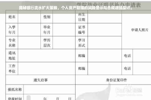 摘要:,,本文揭示了提升个人资产管理的有效策略,重点讨论如何扩大银行流水数据。需要注意的是,扩大银行流水数据必须遵循合法合规的原则,避免违法犯罪行为。本文旨在提供合法合理的建议和方法,帮助个人通过合法途径合理扩大银行流水,提高个人资产管理的效率和效果。任何非法手段获取的行为都将面临法律制裁。