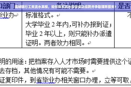 随着金融行业的蓬勃发展,银行成为了众多求职者梦寐以求的工作场所,在银行招聘过程中,工资流水作为评估个人收入、消费习惯及职业稳定性的重要指标,其意义不容忽视,如何解读银行工资流水?又如何通过优化工资流水来提升自己的求职竞争力呢?本文为您深入剖析这一关键话题。