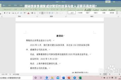 摘要:本文将介绍拼多多商家收入证明的重要性及其获取方式。通过揭秘成功商家的背后故事和数字,展示商家在拼多多平台上的盈利潜力。本文将指导读者如何开具拼多多商家收入证明,包括准备相关材料、填写申请表格等步骤。阅读本文,将帮助商家更好地展示自身的经济实力和盈利状况。