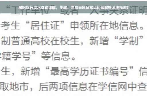 随着个人财务管理需求的日益增长,银行流水查询已成为我们日常生活中不可或缺的一部分,对于生活在揭阳地区的朋友们来说,了解如何正确查询银行流水、注意事项以及解决可能遇到的问题至关重要,本文将详细指导您在揭阳地区进行银行流水查询的步骤,并提醒您需要注意的事项,同时解答您在查询过程中可能遇到的常见问题。