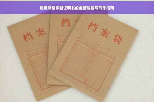 摘要:,,本篇文章将全面解析肌腱撕裂诊断证明书的撰写方式。内容包括诊断证明书的格式、必要信息点,如患者基本信息、撕裂部位、程度及可能的治疗建议等。文章旨在帮助读者了解如何准确、规范地撰写肌腱撕裂诊断证明书,确保信息的完整性和准确性,为患者提供有效的医疗证明。