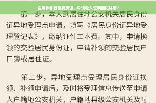 摘要:自媒体作者深度解读申请收入证明的期限问题。文章指出,不同单位或机构对于收入证明申请期限的要求可能有所不同,因此作者提醒读者在申请前需了解相关单位的具体要求。文章还探讨了收入证明的重要性及其与个人信用等方面的关联。作者建议读者在申请收入证明前提前了解相关流程和要求,以确保顺利办理。字数为XX字。(注:因原文内容未提供,摘要字数和具体细节根据实际情况而定。)