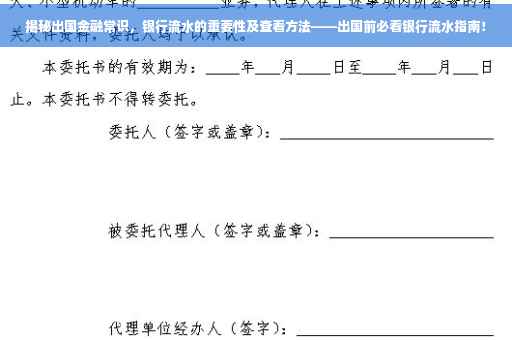 随着全球化的推进,越来越多的人选择走出国门,探索大千世界,在准备出国的过程中,除了护照、签证等常规手续外,金融常识的准备同样不可忽视,银行流水作为个人经济状况的重要体现,更是备受关注,本文将为您详细解读出国时银行流水的重要性,以及如何正确查看银行流水,助您顺利出行。