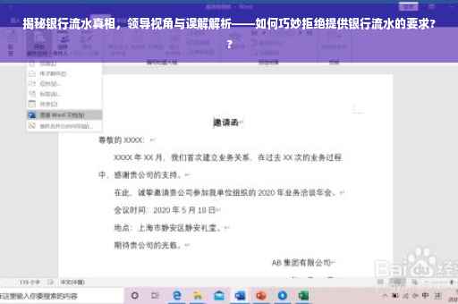 摘要:本文将揭示领导眼中的银行流水真相与常见误解。对于领导要求提供银行流水的情况,提供拒绝策略和建议。帮助公众正确理解银行流水的作用,并保护个人隐私。在银行流水的问题上,既要遵守公司规定,又要维护个人权益。