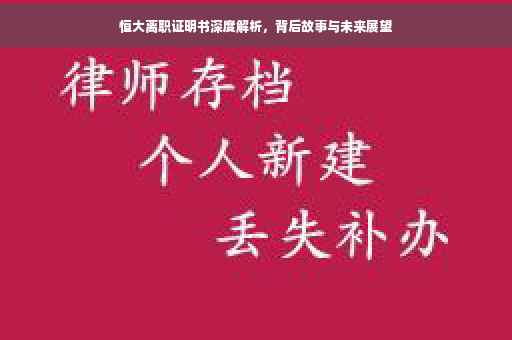 摘要:恒大离职证明书揭示出公司内部故事和未来展望。随着员工离开,背后原因引人关注。本文将探讨离职背后的故事,并分析这对公司未来的影响。我们将关注这些离职员工未来的职业发展方向,以及恒大公司的未来发展前景。