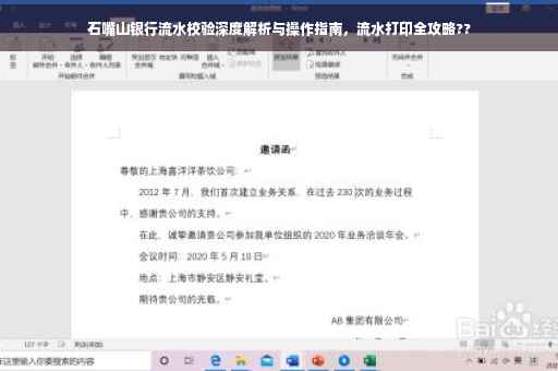 石嘴山银行流水校验是保障金融安全、提高信贷审批效率的重要环节,本文详细介绍了石嘴山银行流水校验的相关知识、流程和实践指南,希望能帮助读者更好地了解并应用,建议读者在申请流水校验前,充分了解相关政策和流程,以便顺利完成申请。
