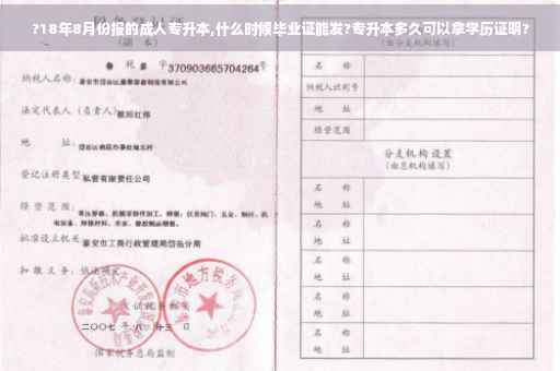 根据我所了解的情况,如果是在18年8月份报名的成人专升本,毕业证发放时间一般在申请毕业后的两个月左右,也就是说大约在10月份左右可以拿到毕业证。但是具体时间可能会因不同的学校和专业而有所差异,建议直接咨询所报读的学校或教育机构,以获取最准确的信息。同时,也需要注意的是,毕业证发放前需要完成相关的课程学习和考试,并且符合学校的毕业要求,才能顺利拿到毕业证。