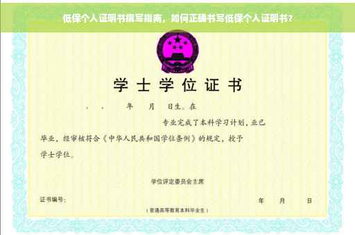 摘要:,,本文介绍了低保个人证明书的写法,内容涵盖证明书的格式、需要包含的基本信息以及注意事项等。文章指出,写低保个人证明书需要准确填写个人信息,包括姓名、性别、年龄、家庭住址等,同时需要说明申请低保的原因和家庭经济状况。文章强调证明书的真实性和准确性对于申请低保的重要性,并提醒申请人注意书写规范和格式要求。