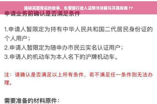 摘要:东营银行收入证明书是展示个人薪资水平的重要文件。本文将为您揭秘高薪背后的故事,并详细指导如何开具东营银行收入证明书。通过简单步骤,轻松获取您的收入证明,为您的职业生涯和个人发展助力。