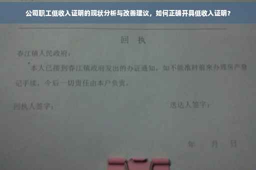 摘要:,,本文分析了公司职工低收入证明的现状,指出了存在的问题和挑战。针对这一问题,文章建议公司建立更加公正、透明的薪酬体系,提高职工收入水平。文章还介绍了如何开具公司职工低收入证明,包括证明内容、格式和注意事项等。旨在帮助职工维护自身权益,促进社会公平正义。