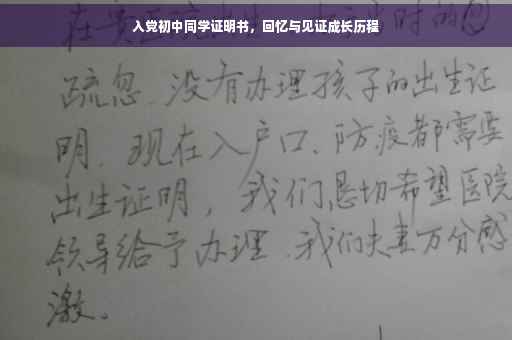这份入党初中同学证明书,详细记录了我的这位同学在初中时期的表现,包括他的学习成绩、参与活动、集体荣誉等方面的情况,还对他的性格特点、道德品质等方面进行了评价,通过这份证明书,我们可以清晰地看到他的优秀品质和潜力。