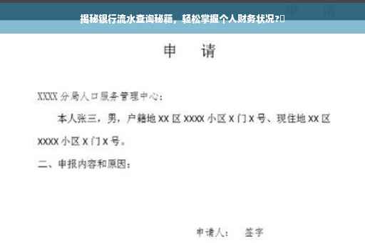 3、顺利办理金融业务:在申请贷款或信用卡时,银行通常需要提供银行流水证明,提前查询银行流水,有助于顺利办理金融业务。