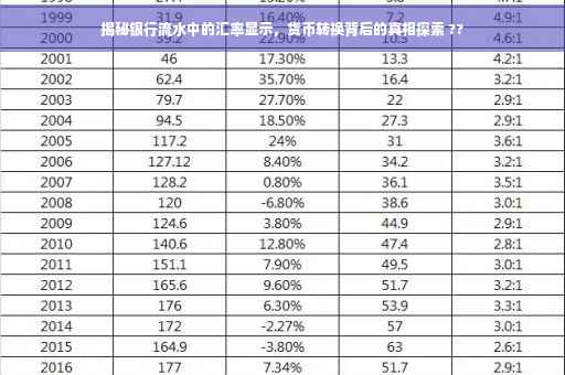 摘要:银行流水记录显示货币汇率,揭示货币转换背后的运作机制。通过银行流水,可以了解不同货币之间的汇率转换过程,解析货币价值变动的秘密。银行作为金融机构,其流水记录反映了货币交易的实际情况,包括汇率的波动。本文旨在探讨如何通过银行流水了解汇率信息,并揭示货币转换背后的机制。