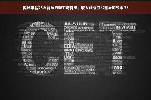 揭秘年薪25万背后的故事,这份收入并非轻松得来。背后是无数日夜的辛勤付出与努力。想要撰写年薪25万的收入证明,需详述个人的职业经历、工作能力以及所取得的业绩。这份证明,是汗水和智慧的结晶。只有真正理解和尊重每一分收入背后的努力,才能明白年薪的真正含义。???