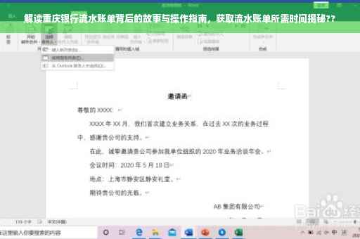 摘要:本文将解读重庆银行流水账单背后的故事,介绍如何通过银行流水账单了解个人或企业的财务状况。提供操作指南,介绍如何获取银行流水账单及注意事项。还将探讨重庆打银行流水所需的时间。帮助读者更好地管理自己的财务,实现财务自由。