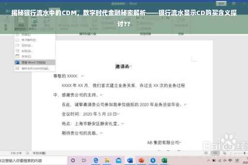 在当今数字化时代,银行业务日益繁荣,银行流水作为记录个人和企业经济活动的凭证,其重要性日益凸显,近年来,不少人在查询银行流水时,发现其中出现了“CDM”这一不明朗的缩写词汇,本文将围绕银行流水中的CDM展开探讨,揭示其背后的含义和可能涉及的业务场景,帮助读者更好地了解个人金融信息。